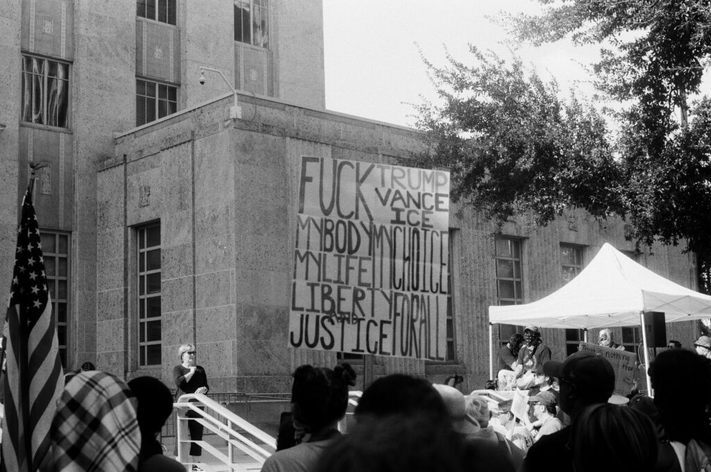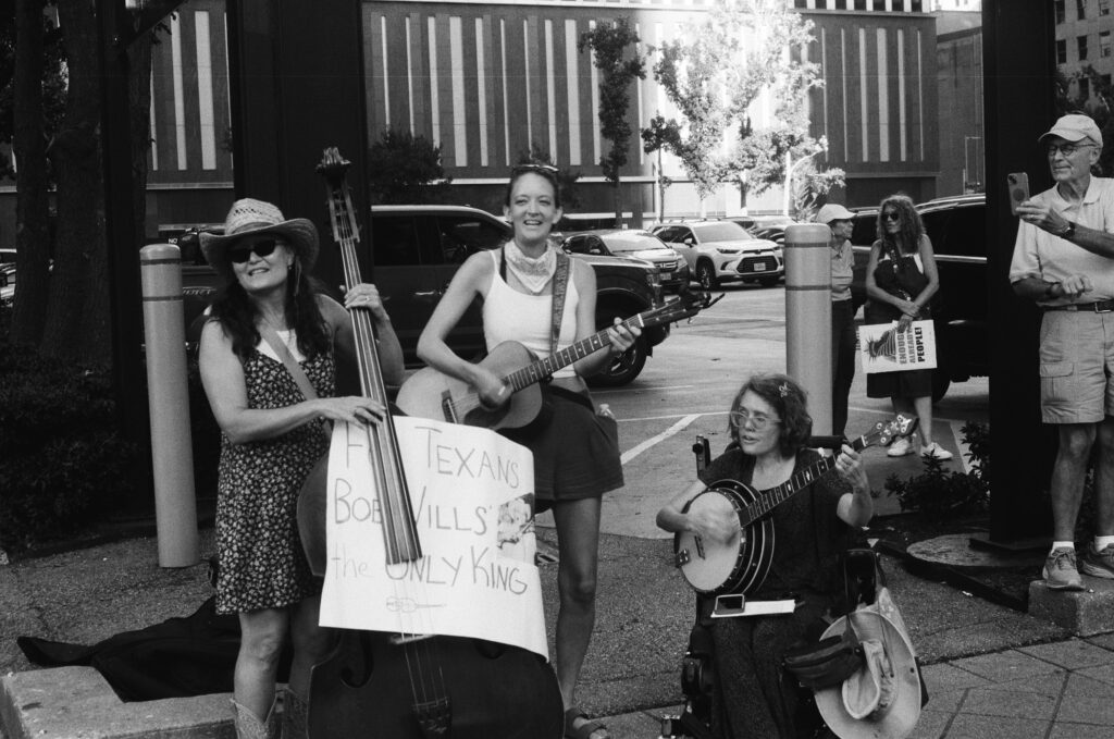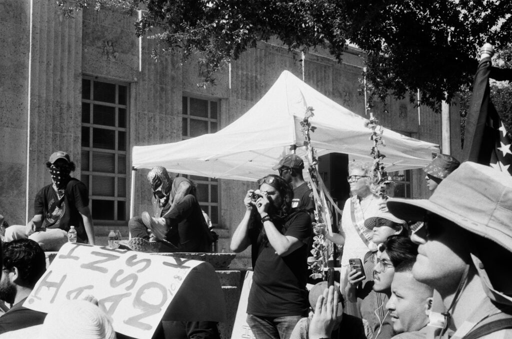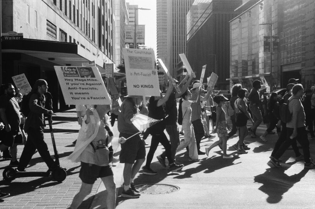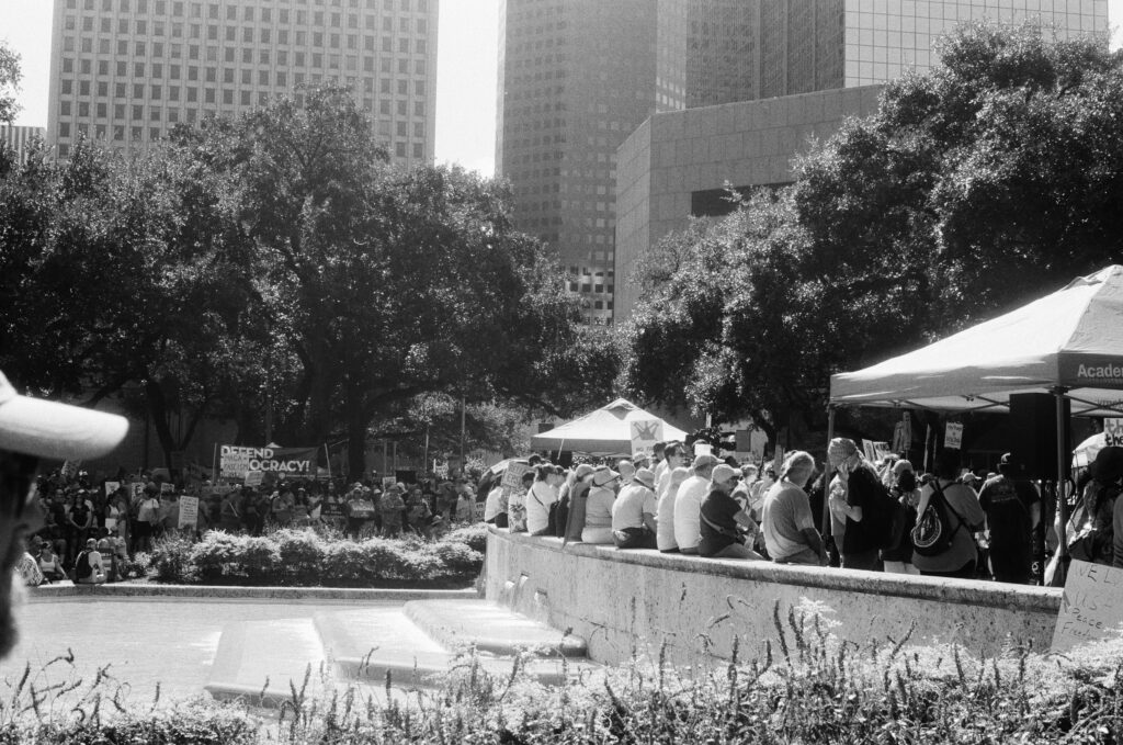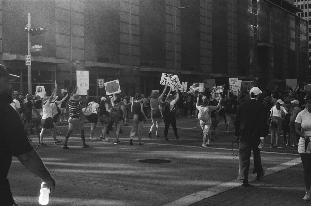 Loaded once again into the Zeiss Ikon Contaflex IV, the camera that refuses to die, I walked into downtown Houston as voices gathered in front of City Hall. The protest signs shouted, “NO KINGS,” “DEFEND DEMOCRACY,” “NO ONE IS ILLEGAL ON STOLEN LAND.”