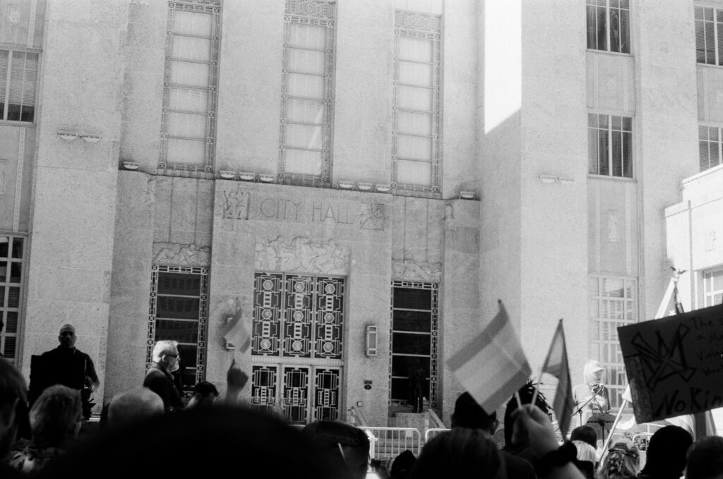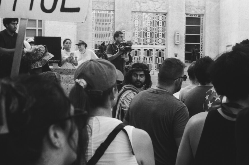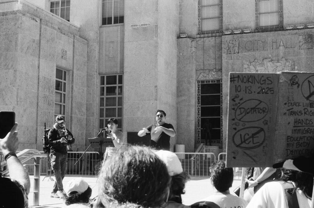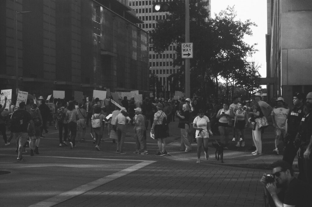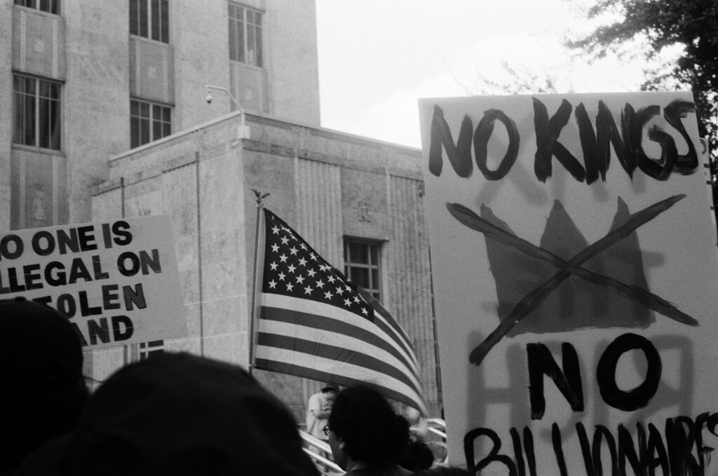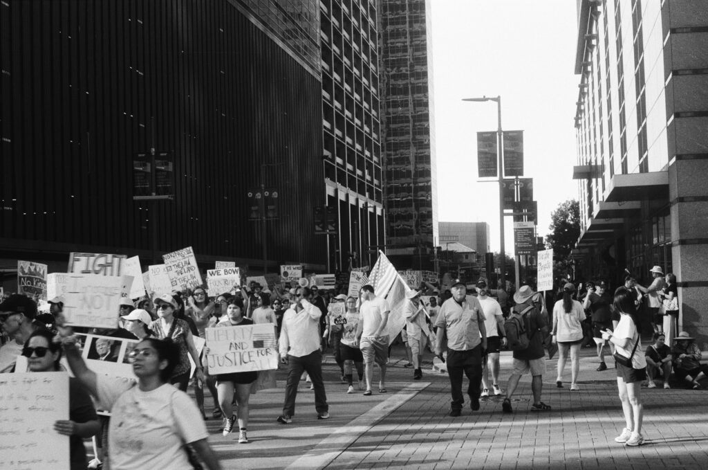 Loaded once again into the Zeiss Ikon Contaflex IV, the camera that refuses to die, I walked into downtown Houston as voices gathered in front of City Hall. The protest signs shouted, “NO KINGS,” “DEFEND DEMOCRACY,” “NO ONE IS ILLEGAL ON STOLEN LAND.”