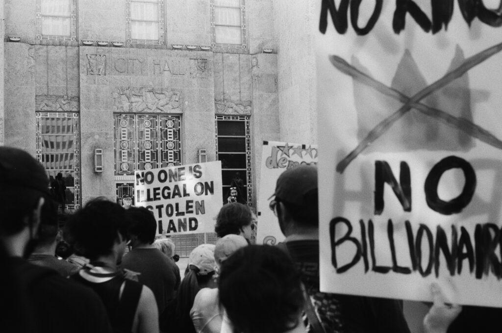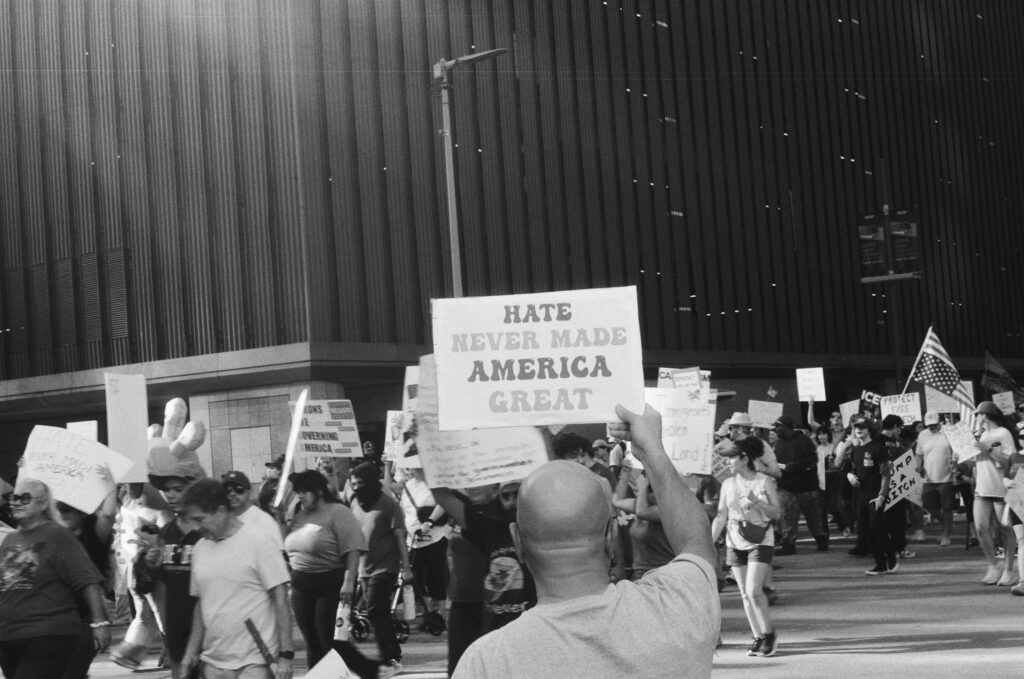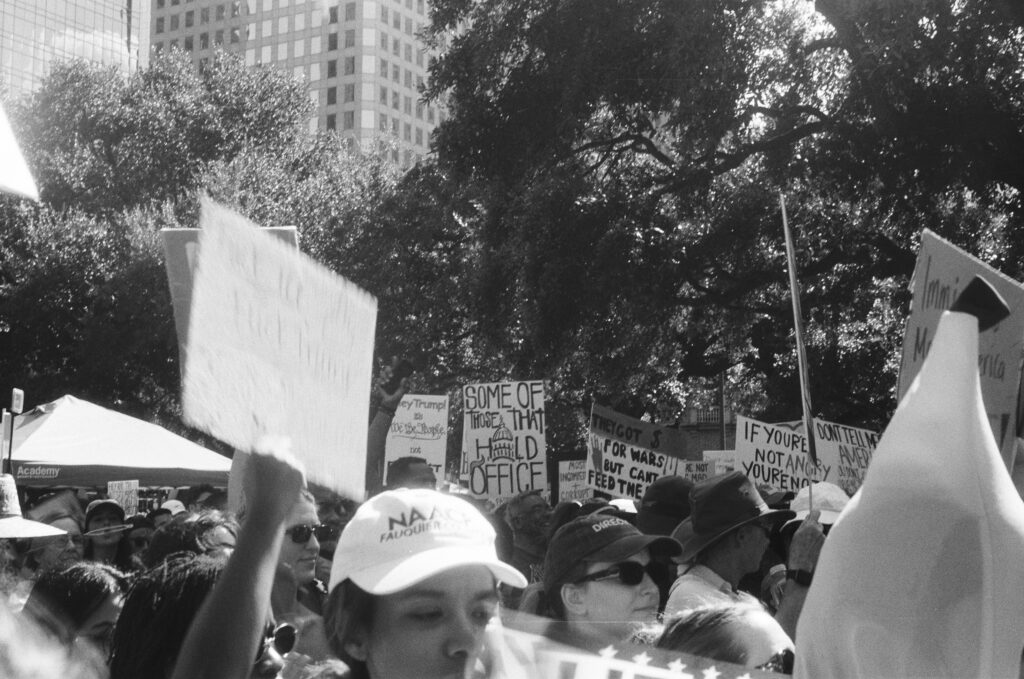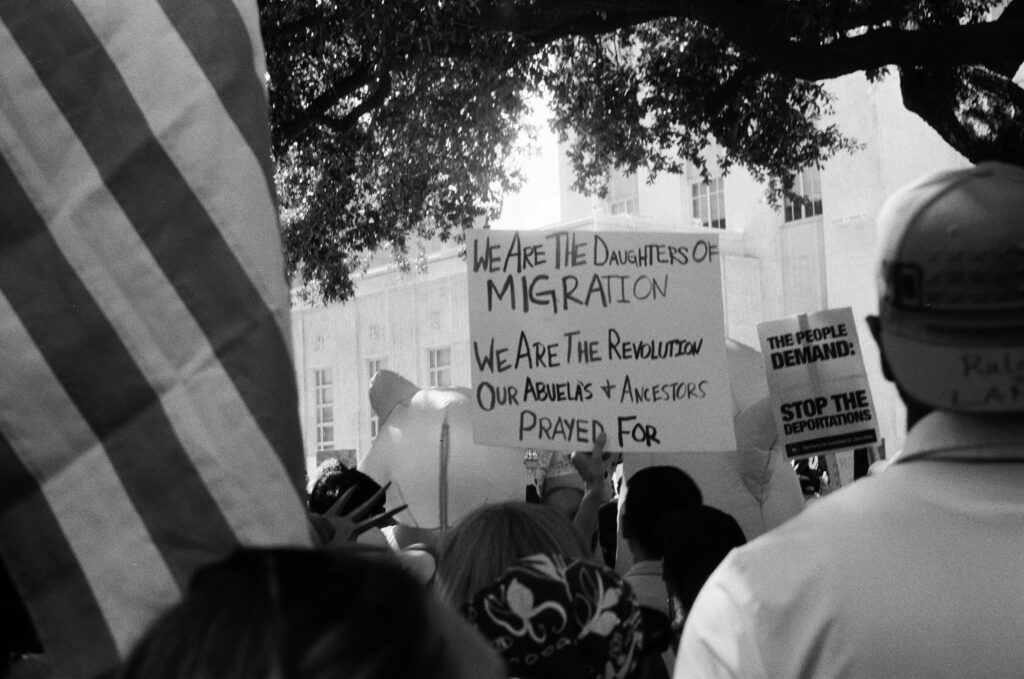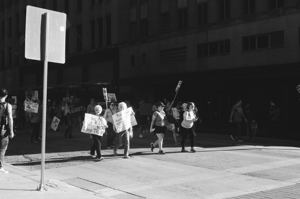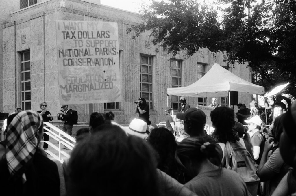Loaded once again into the Zeiss Ikon Contaflex IV, the camera that refuses to die, I walked into downtown Houston as voices gathered in front of City Hall. The protest signs shouted, “NO KINGS,” “DEFEND DEMOCRACY,” “NO ONE IS ILLEGAL ON STOLEN LAND.”