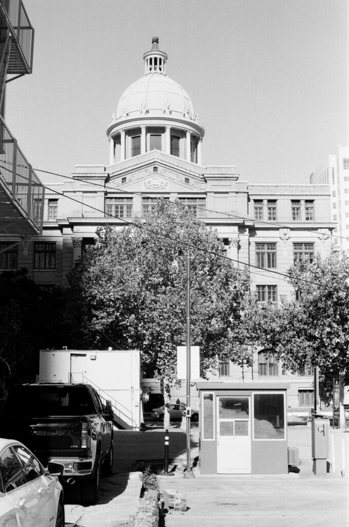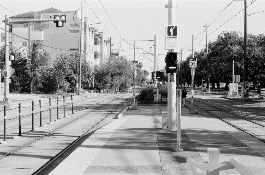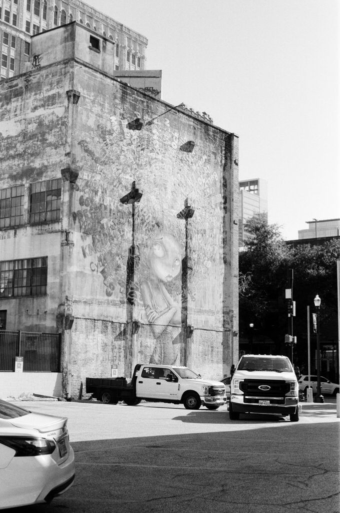 Eastman Double X is a black-and-white film with motion-picture lineage: deep, punchy blacks, luminous highlights, and texture that draws the eye. It’s an analogue choice for a world of gloss and blur. Shot at ISO 250 (or pushed to 400) it handles mixed daylight and deep shadow well—perfect for Houston’s downtown canyon of glass and concrete.